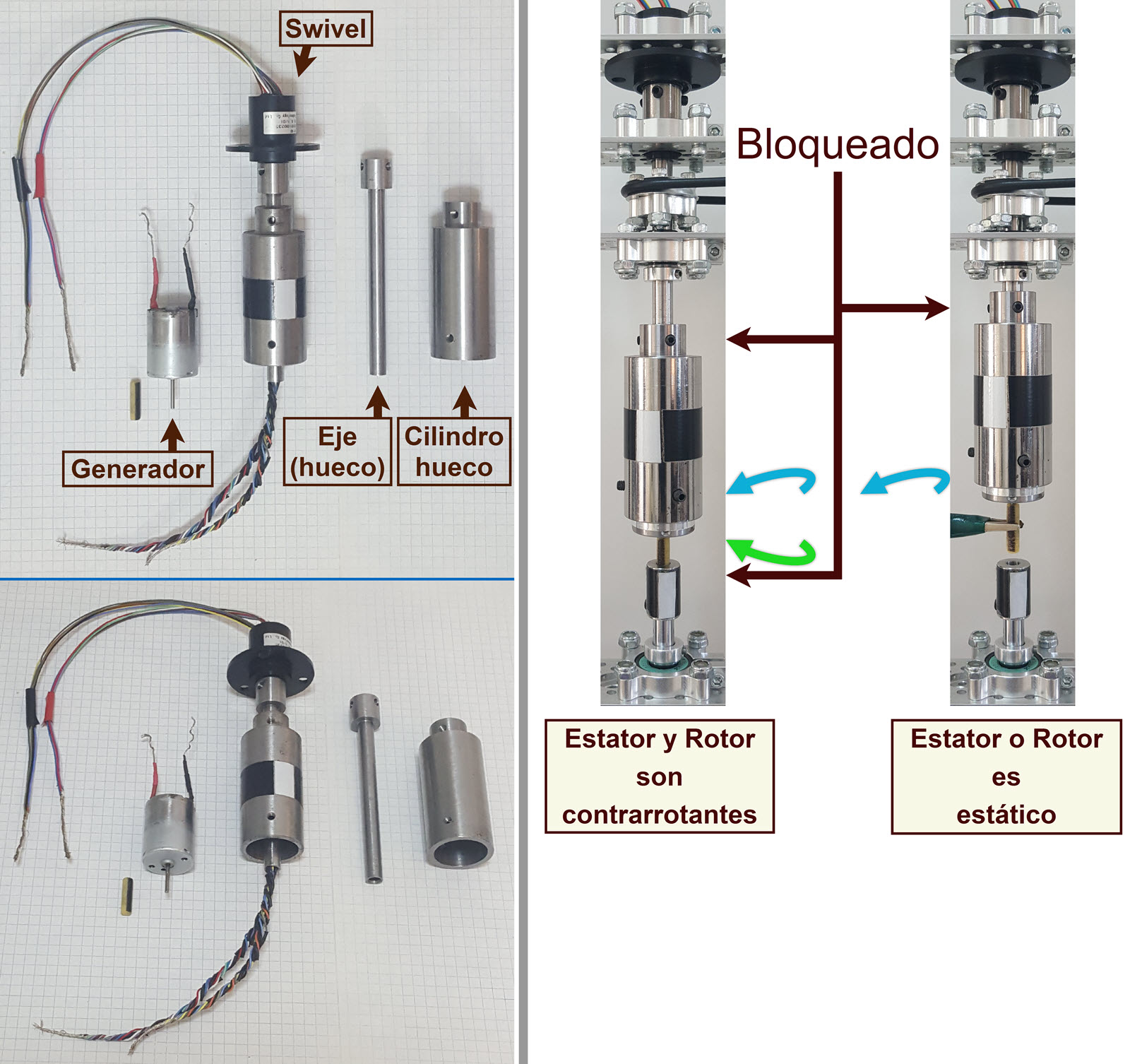 Un adaptador de 9 voltios alimenta el motor inferior en cada video para demostrar una turbina. El modelo tiene dos configuraciones que pueden